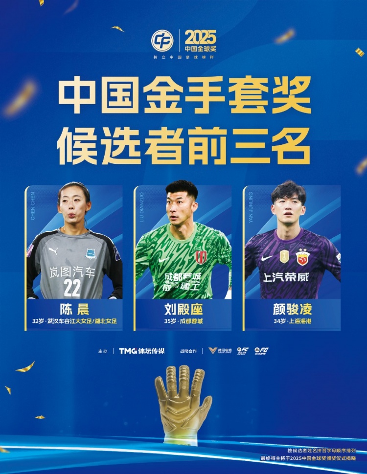 1月22日讯 2025中国金球奖各奖项前三名揭晓,其中金手套奖前三名是陈晨、刘殿座、颜骏凌。
